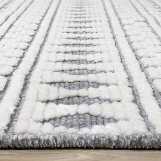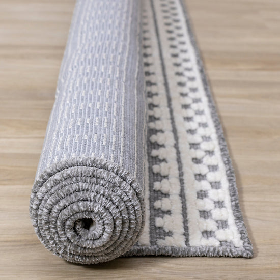 The Lawson collection emanates a casual sophistication with its linear drop-stitch textured construction and approachable designs. Highlighted by rich grey, white, and rust colours this collection is flexible and fashionable, folding for easy shipping and storage. Made from a blend of Heatset Polypropylene and Polyester, with a soft chenille flatweave pile.